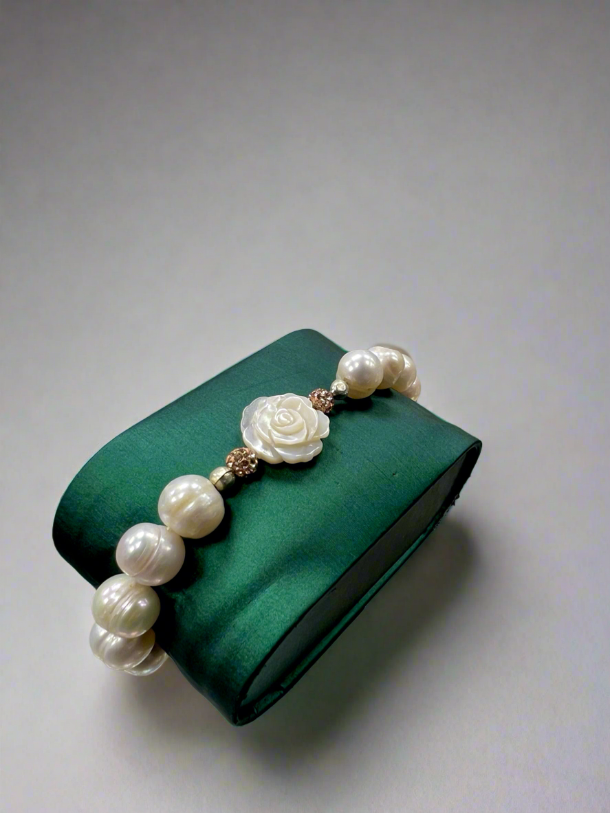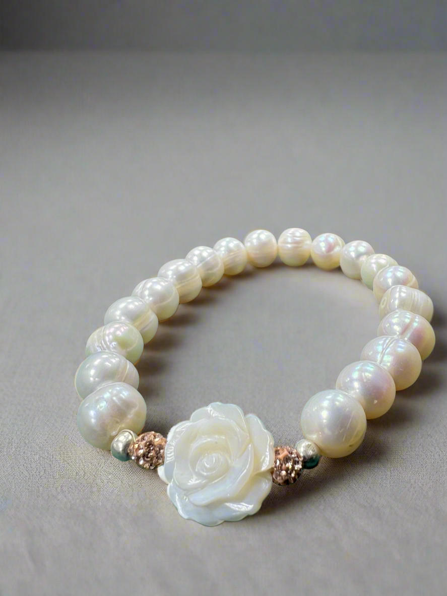 This elegant freshwater pearl bracelet features beautiful, natural pearls paired with a handcrafted mother of pearl flower charm. Made with high-quality freshwater pearls, it offers a smooth, shiny finish and a timeless look. The bracelet is customizable, allowing you to choose the size, pearl type, or flower design to perfectly match your style. Durable and comfortable, it’s a perfect accessory for everyday wear or spe