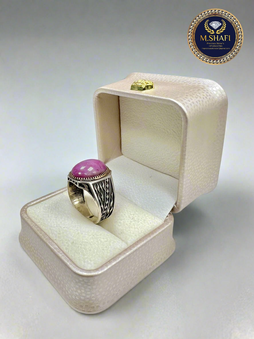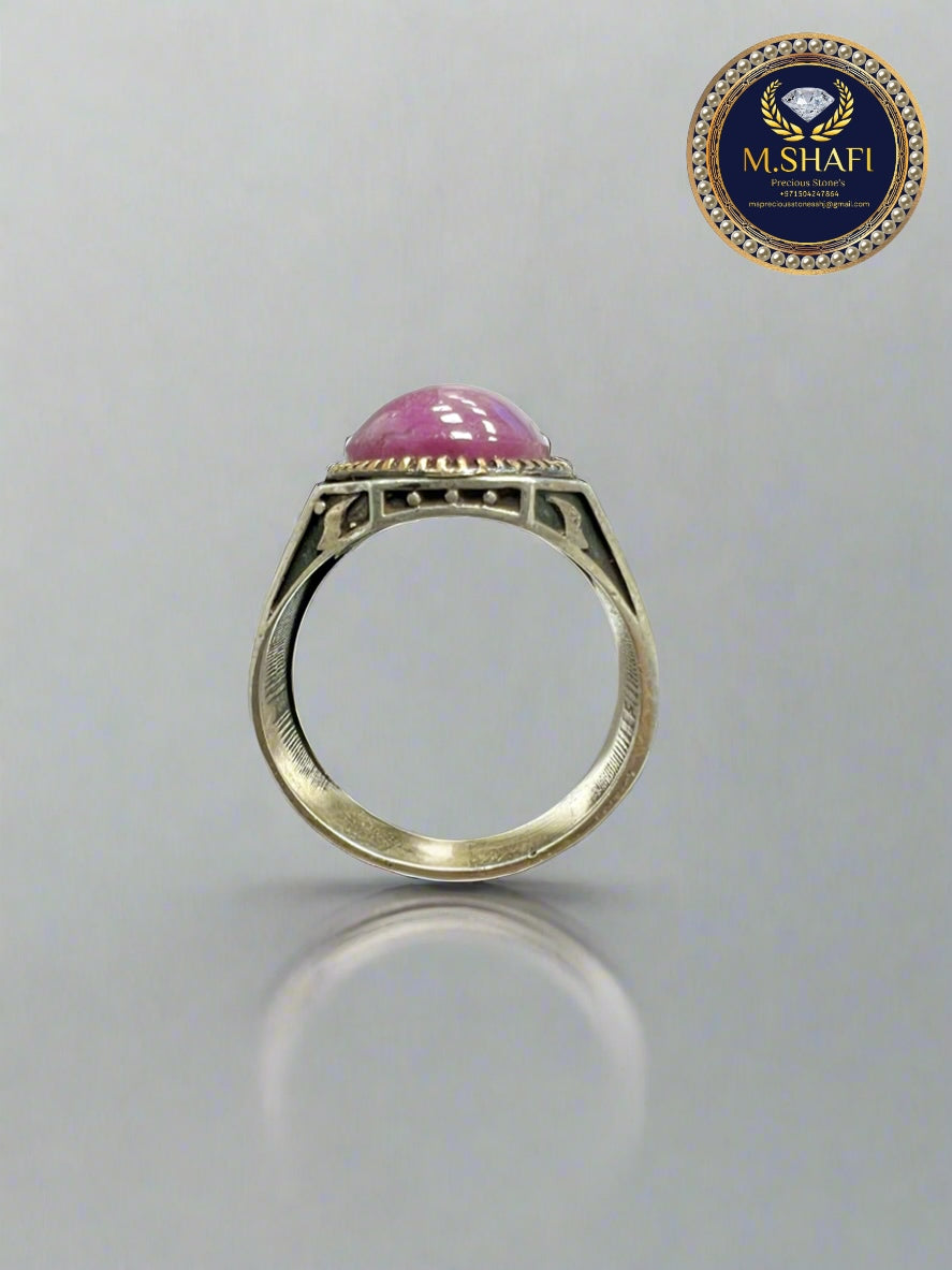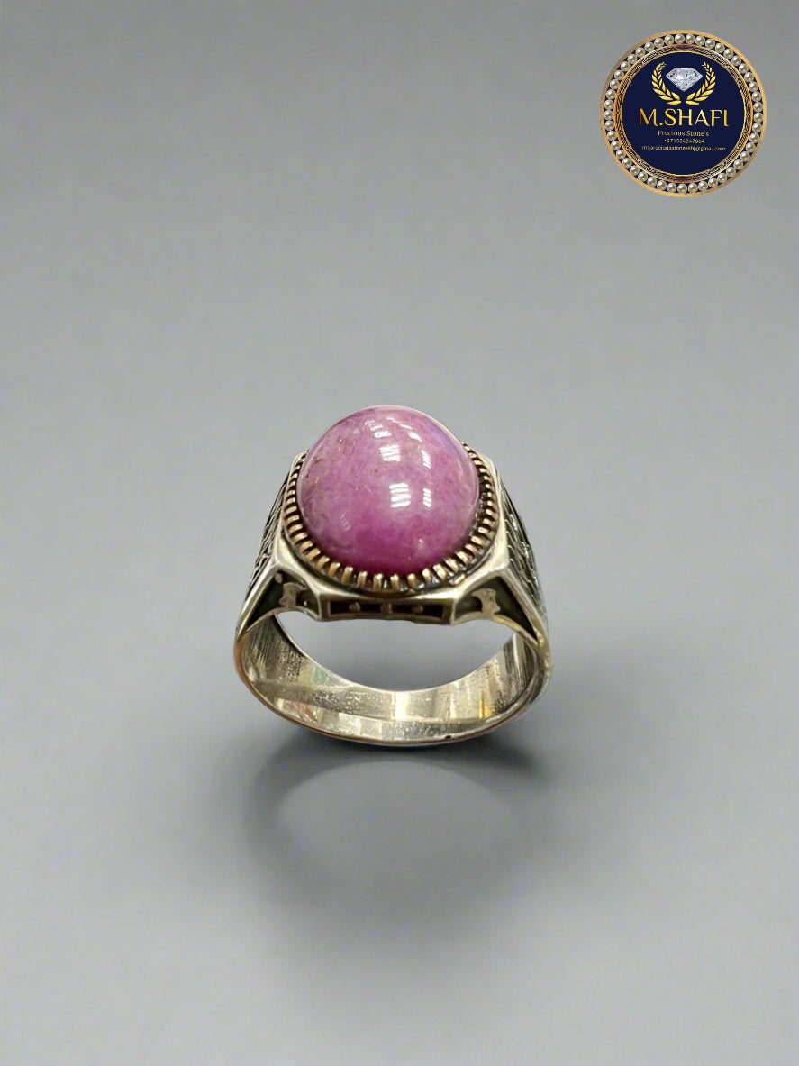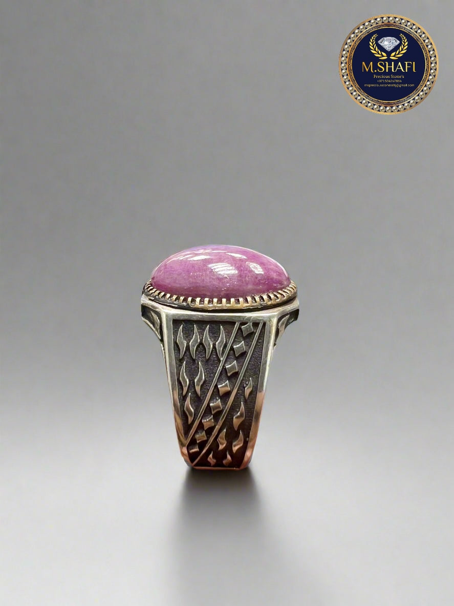 Discover timeless elegance with this handcrafted Silver Cabochon Ruby Ring. Featuring a bold, round ruby gemstone in a smooth cabochon cut, the ring radiates a rich reddish-pink hue that stands out beautifully against the detailed oxidized silver band. The band showcases traditional engraved patterns, giving it a strong masculine character with a classic tribal touch.
