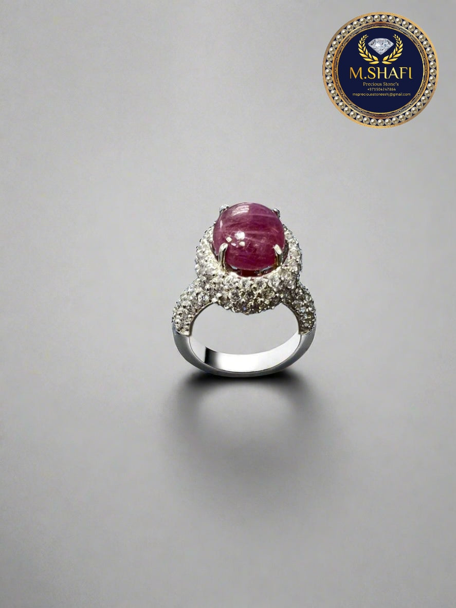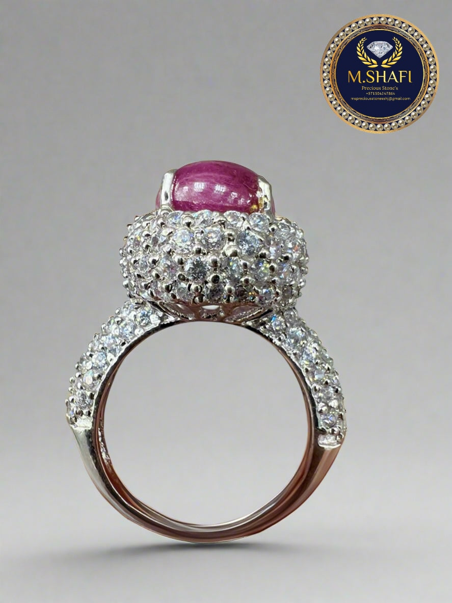 This elegant silver ring features a big oval ruby in the center with a deep red color. The ruby is held with four prongs and is surrounded by shiny white zircons. The band is also fully covered with sparkling zircons, giving it a rich and eye-catching look. Perfect for parties, weddings, or special gifts — this ring adds a touch of luxury to any outfit.