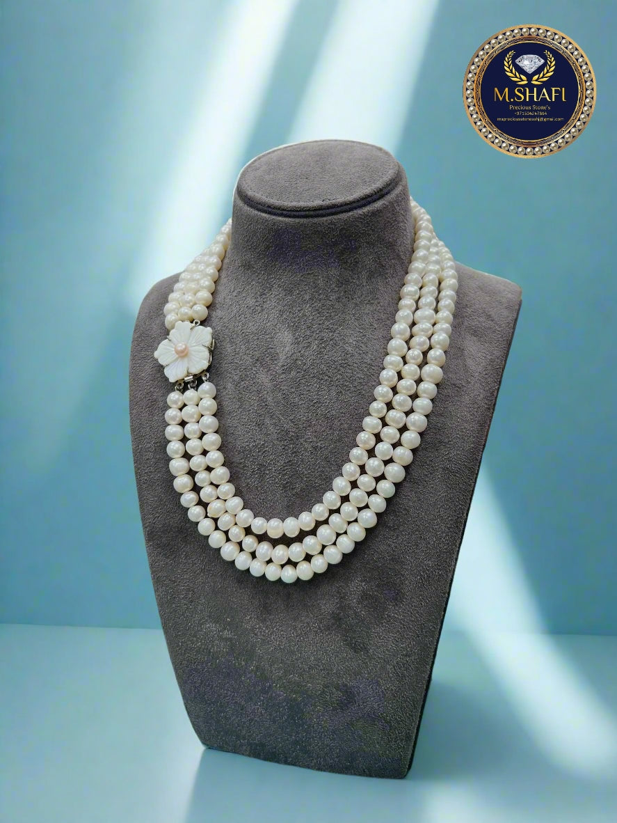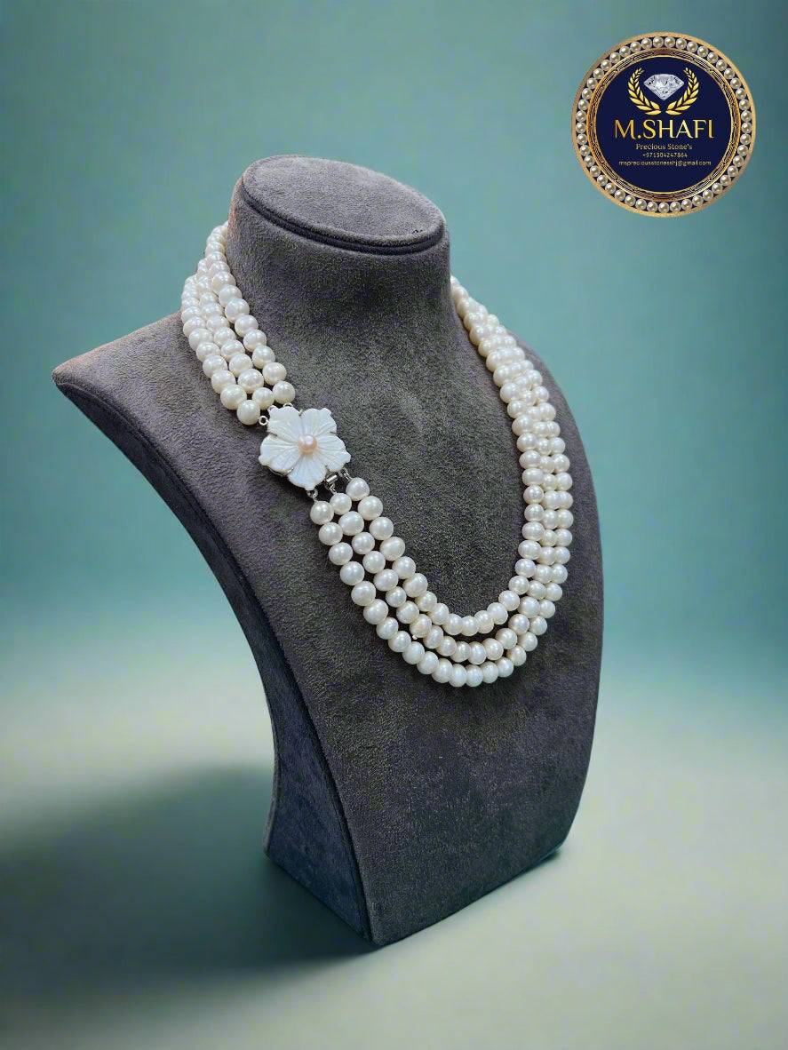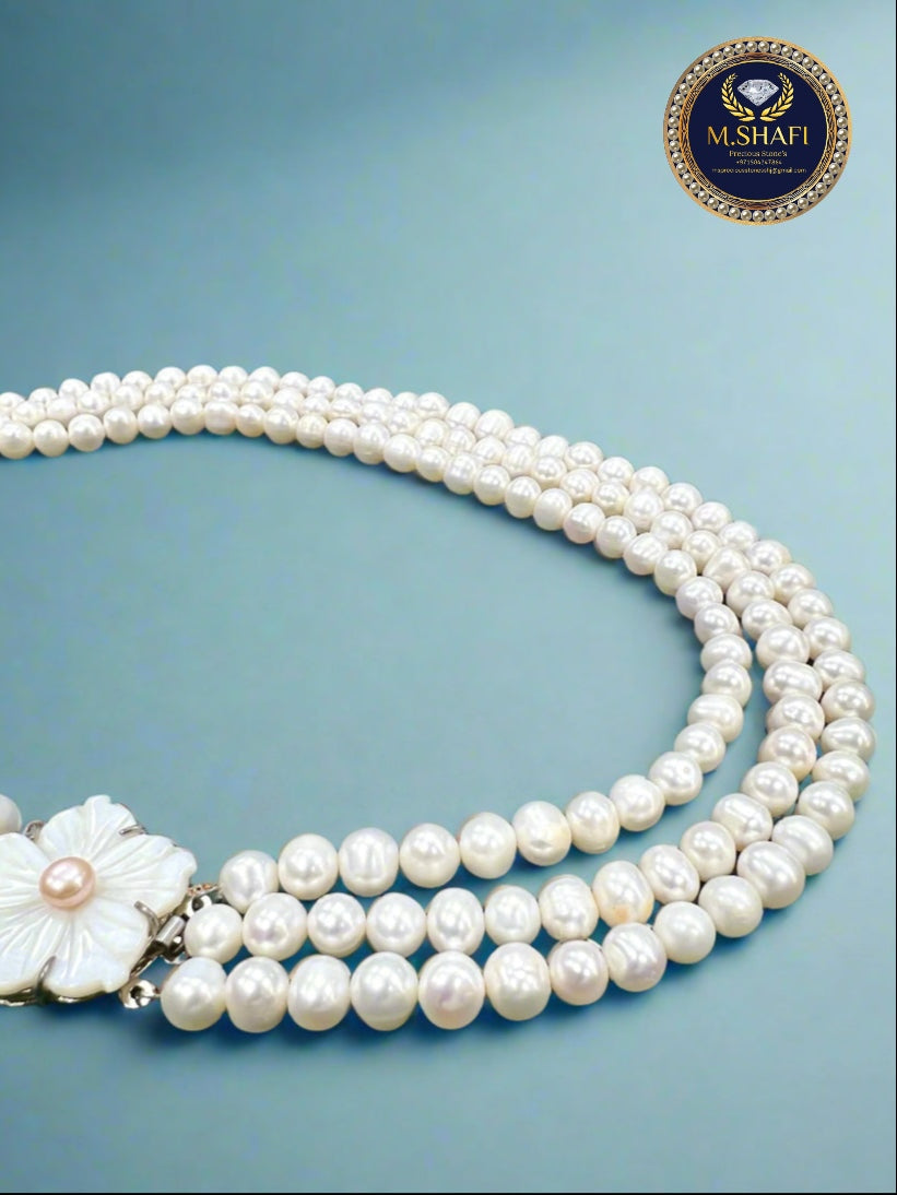 This elegant 3-line necklace is crafted from natural freshwater pearls, offering a soft, radiant shine and smooth finish. Each strand is carefully hand-strung to create a graceful, layered look, while Mother of Pearl accents on the sides add a delicate, luxurious touch. The necklace weighs 171 grams, giving it a rich and substantial feel.