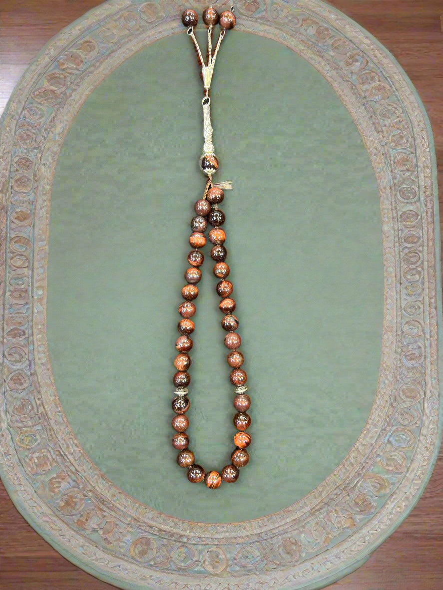 This 33-bead tasbih is made from polished brown tiger eye stone, known for its rich golden-brown tones and natural chatoyancy – the unique light-reflecting effect that gives the stone a glowing look.