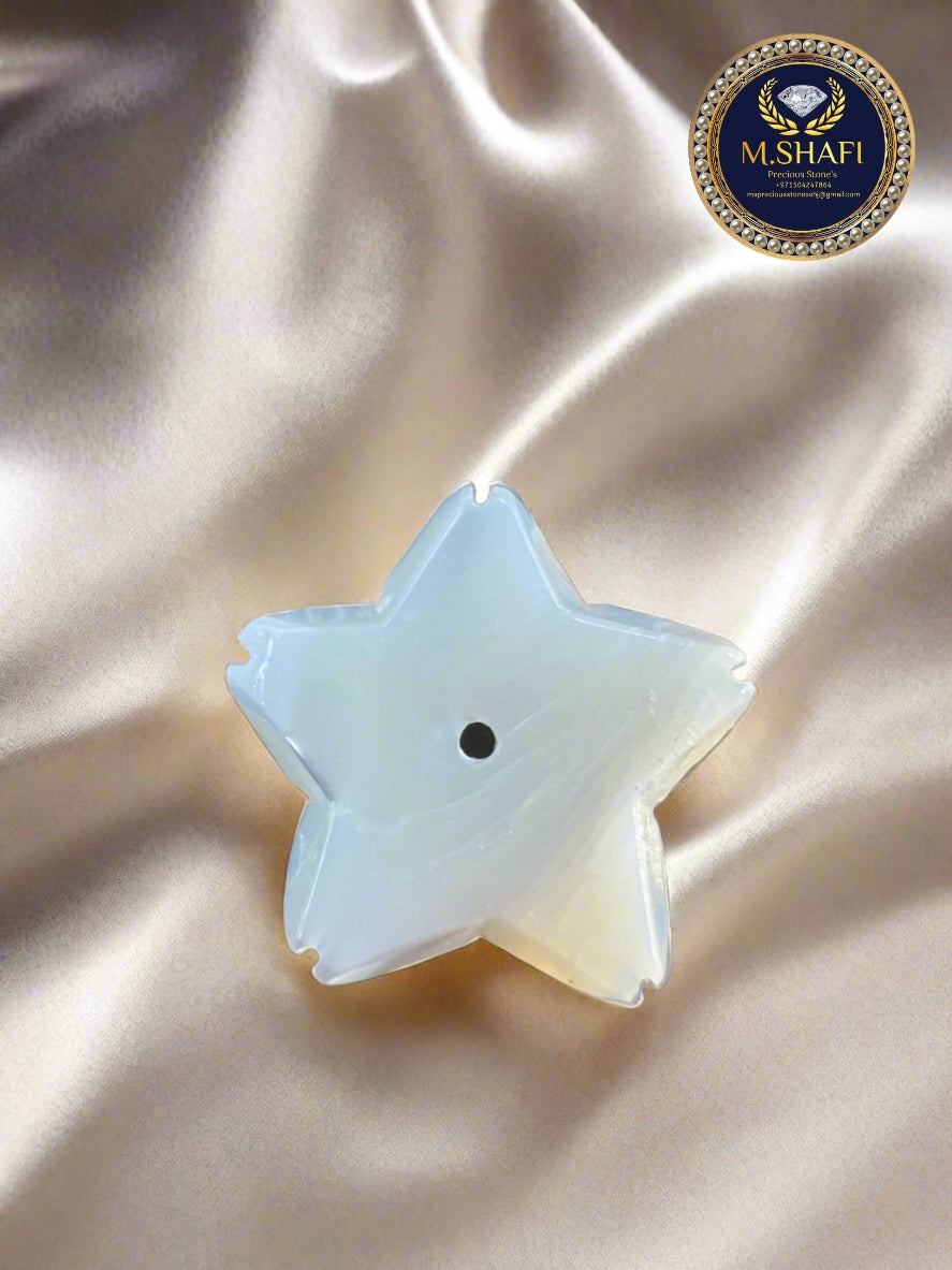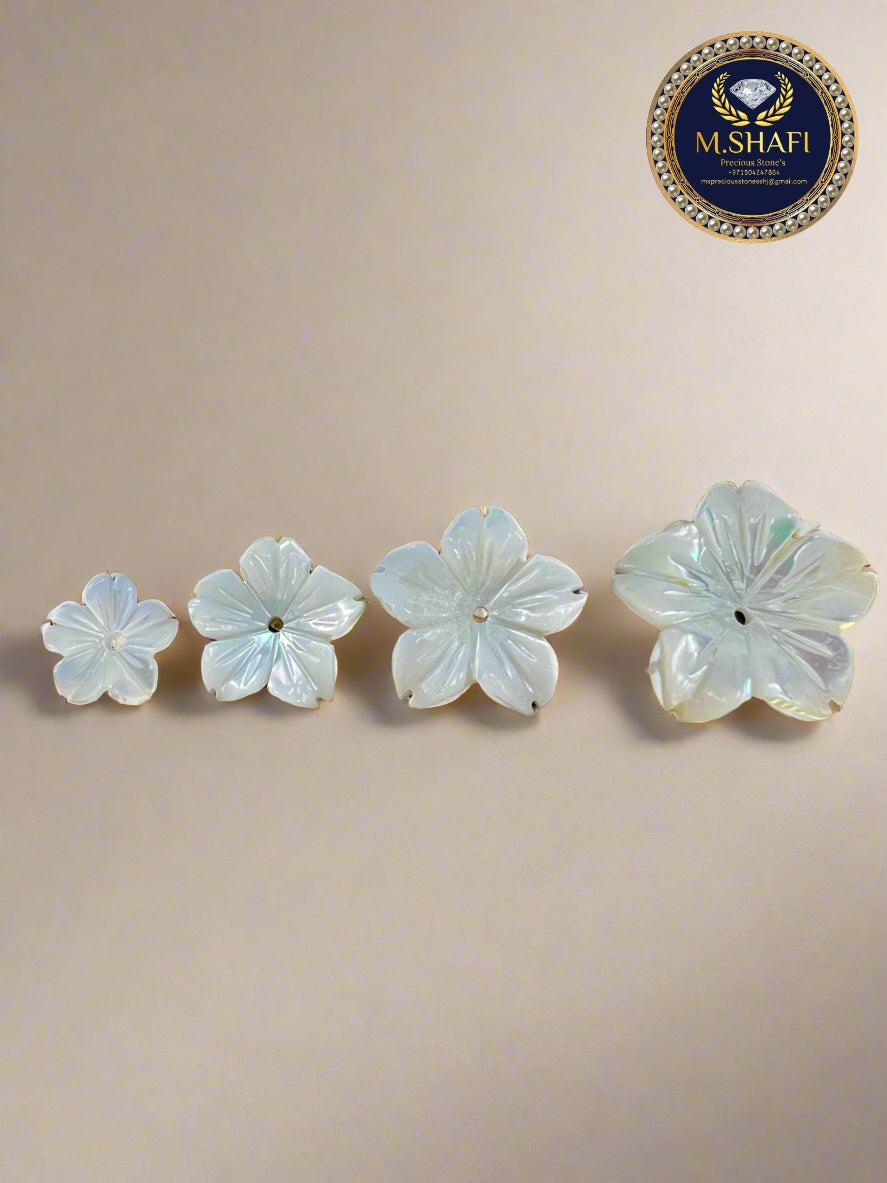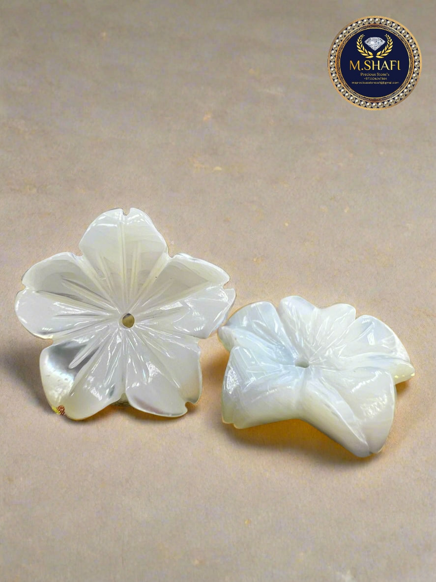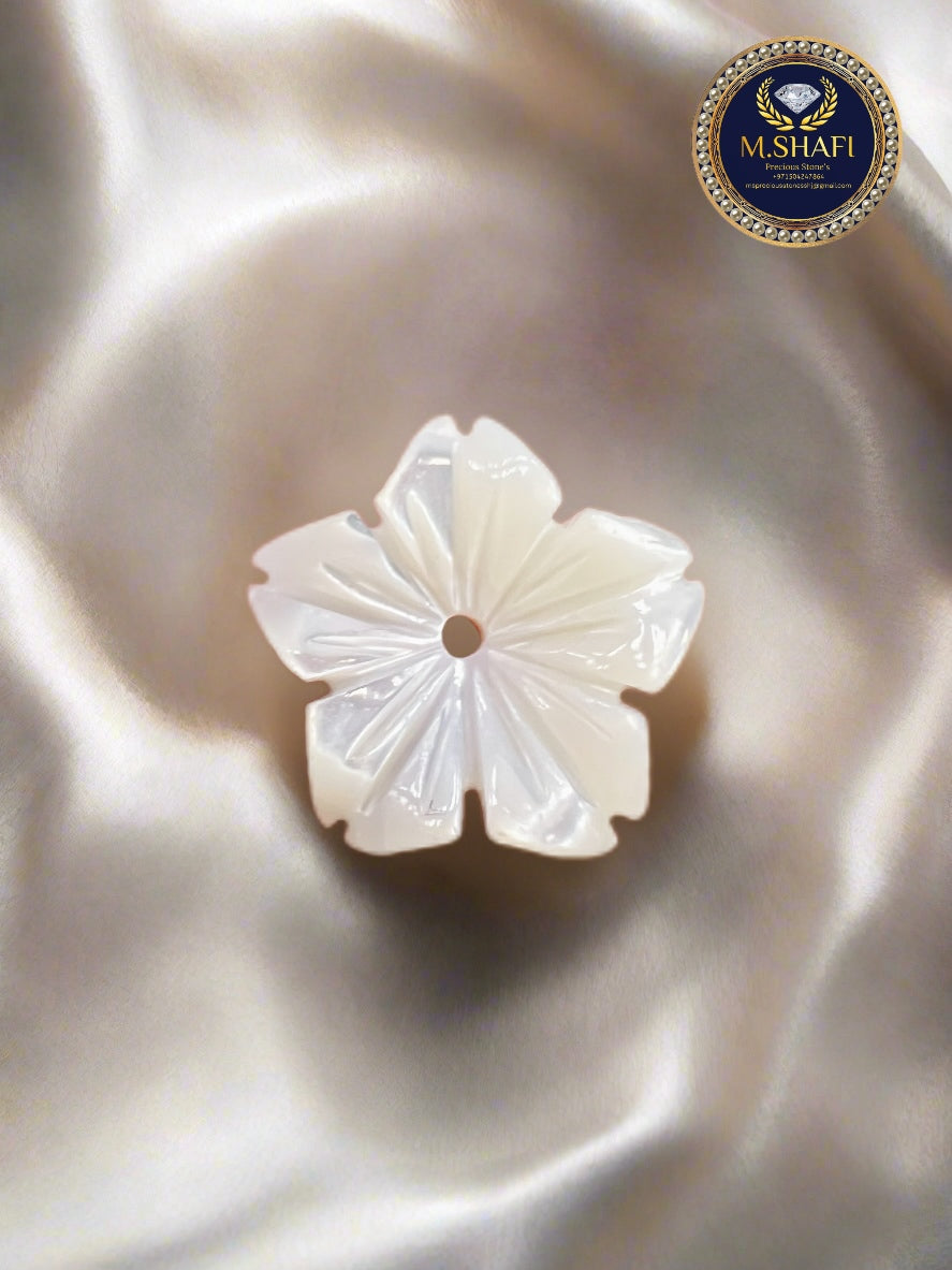 This white mother of pearl star-shaped flower is finely carved on one side with a smooth flat back and features a center hole for easy attachment. ✨ Perfect for wholesale buyers and jewelry makers, it’s ideal for creating beautiful gold and silver rings, pendants, earrings, and bracelets. The natural white mother of pearl shines softly, adding a touch of elegance and luxury to any design. 💎 Lightweight yet durable, this piece is easy to work with and fits securely thanks to the flat back and center hole. 🎨 Great for custom, bridal, and high-end jewelry collections, it offers versatility, quality, and style at an affordable wholesale price. 💼